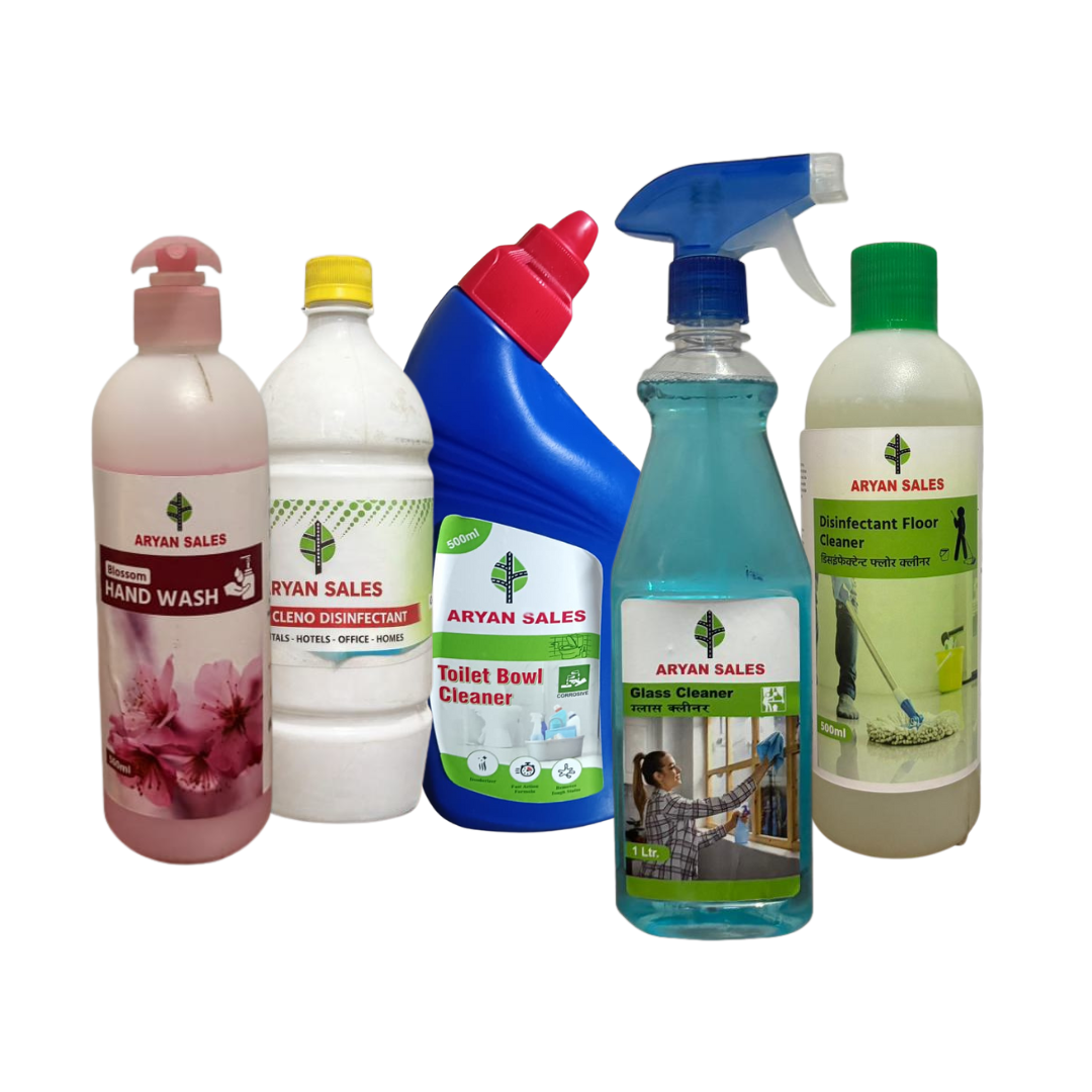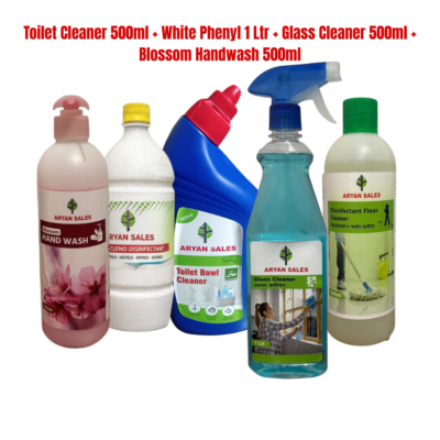 All-in-one home hygiene solution from Aryan Sales. Includes toilet cleaner, white phenyl, glass cleaner, and blossom handwash for complete bathroom, floor, glass, and hand hygiene.