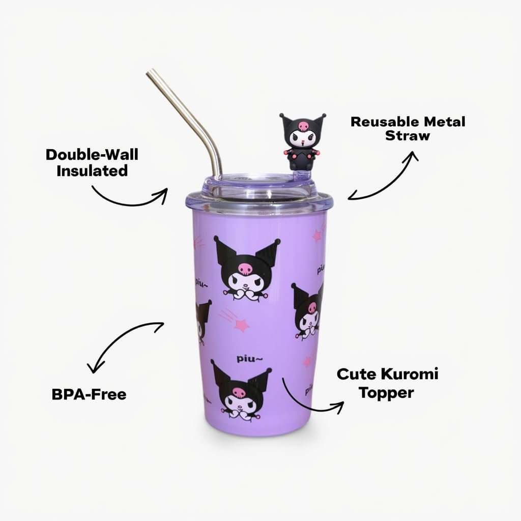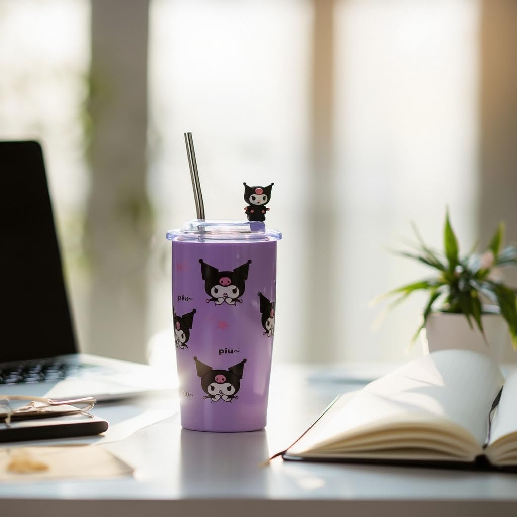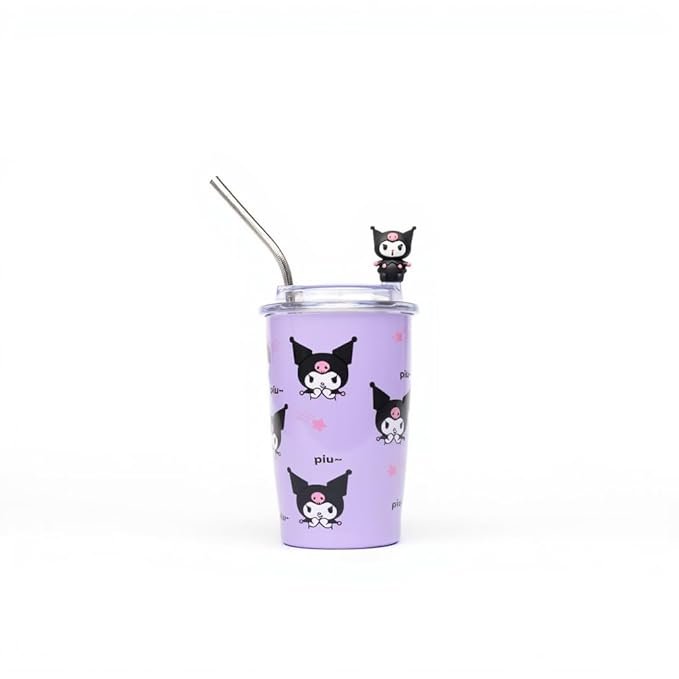 510ml insulated cute cartoon tumbler with straw. Stylish purple travel cup, ideal for cold drinks, juice and daily use.