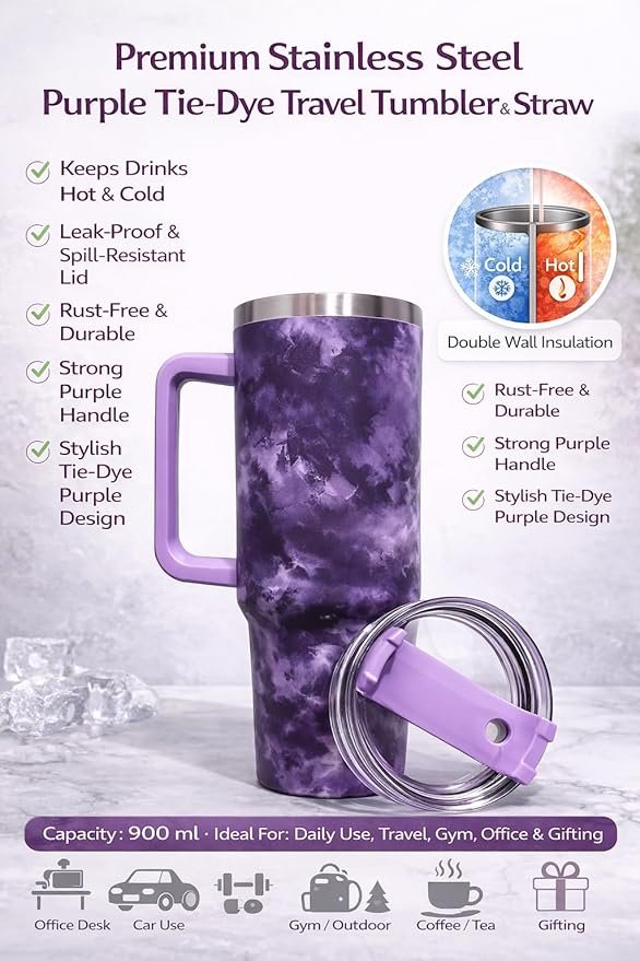 The large 1200ml capacity makes it perfect for coffee, tea, water, or cold drinks during work, travel, or long outings. It features a strong handle for easy grip and a lid with straw for convenient, spill-free sipping. The elegant Purple colour with a modern patterned finish gives it a premium and stylish look, suitable for both personal use and gifting.