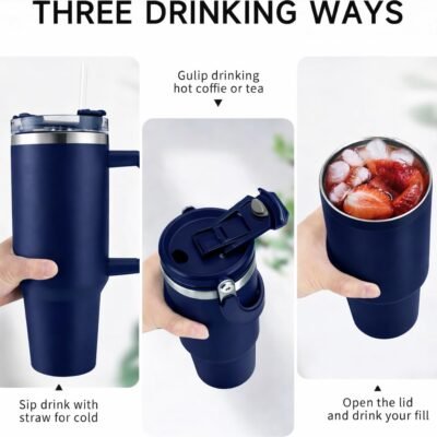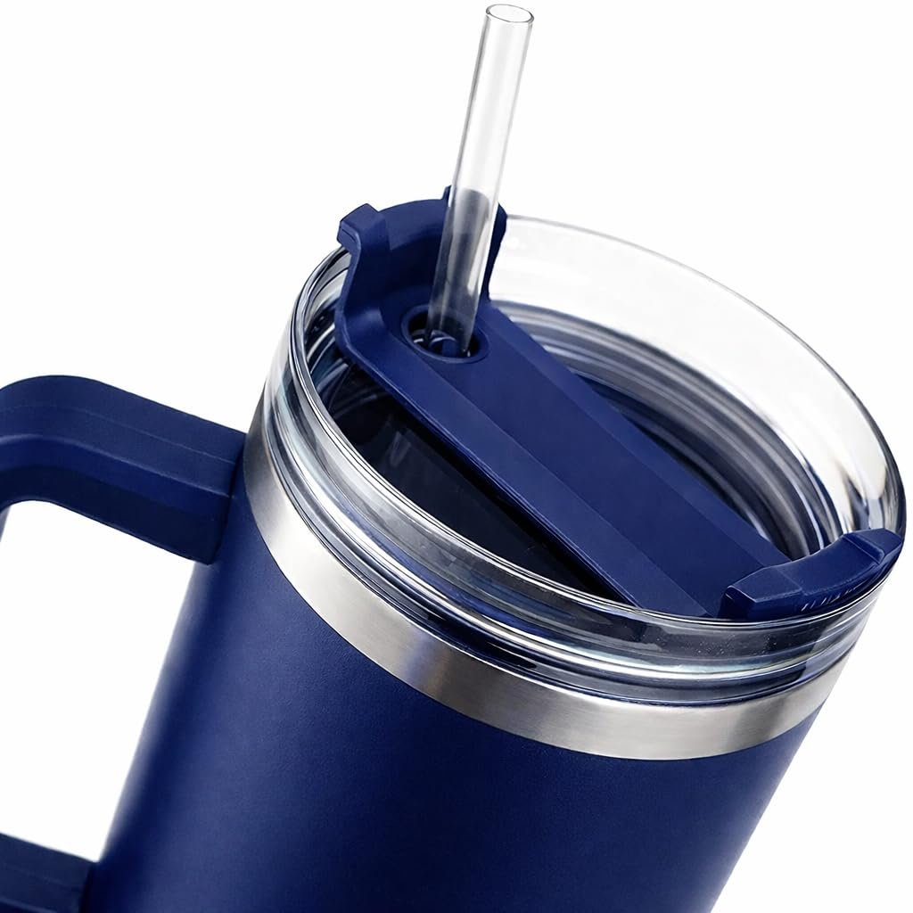 1200ml stainless steel insulated travel tumbler with handle and straw. Double wall vacuum design for hot and cold beverages with a leak-proof lid in Blue colour.